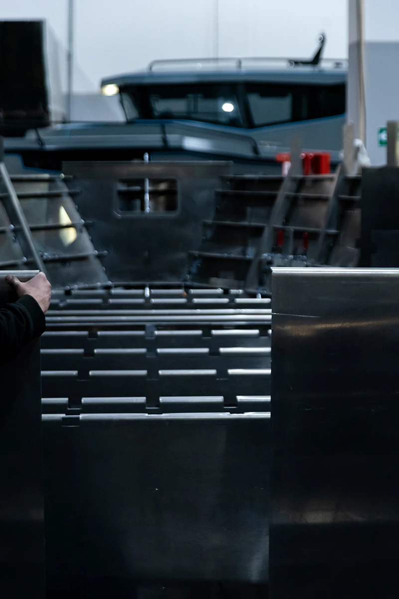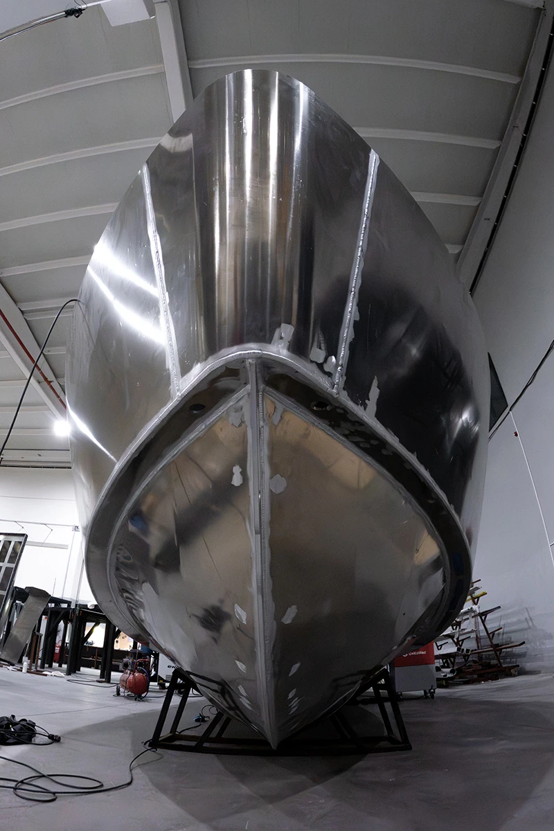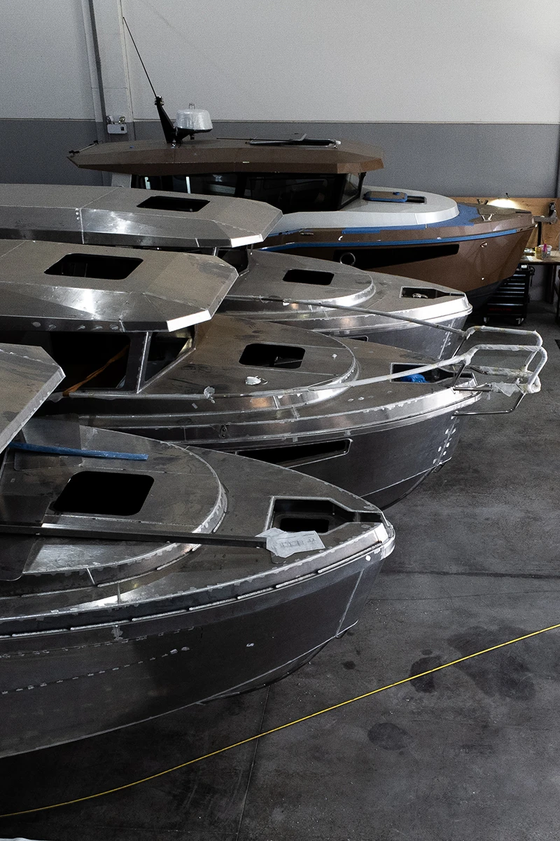 In the welding area highly skilled highly skilled and experienced welders meticulously assemble the cut aluminium sections to create the boat's hull. The welding process requires expertise to ensure that the seams are secure, watertight and corrosion resistant and form a strong foundation of the boat that will withstand the harsh maritime environment.