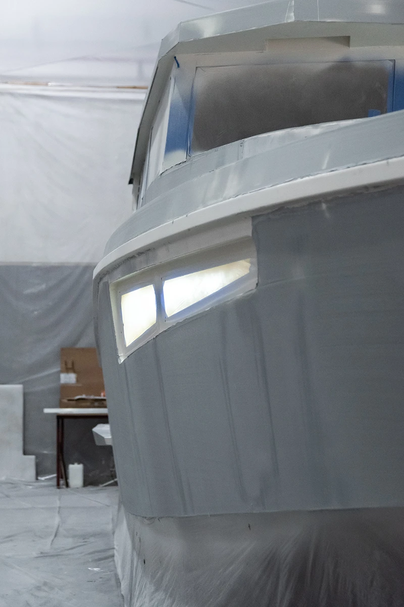 Then each boat is moved to the paint shop for the next step, which takes about 2 months. From the pre-sanding and preparation of all surfaces to create the perfect smooth base, to the careful application of the finishing coat, everything is handcrafted by our specialists. The use of premium marine-grade materials enhances the aesthetic appeal of the boat while giving an additional level of protection against saltwater corrosion and environmental exposures.